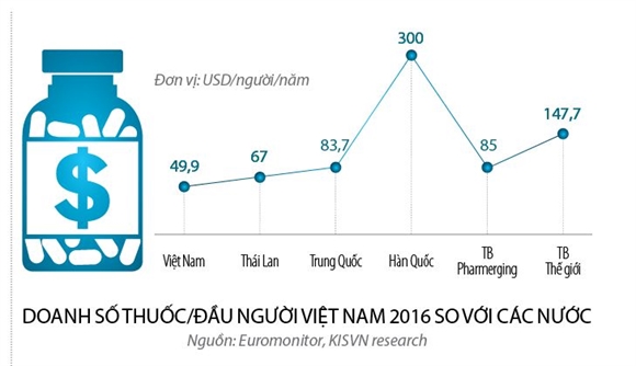 Theo Công ty Nghiên cứu thị trường Euromonitor International, mức chi tiêu thuốc bình quân theo đầu người chỉ mới dừng lại ở mức 49,9 USD vào năm 2016, chỉ bằng 1/3 mức trung bình của thế giới (147,4 USD). Nhìn chung, ngành dược phẩm Việt Nam được kỳ vọng sẽ giữ được nhịp độ tăng trưởng mạnh 10-15%/năm trong các năm sắp tới để đạt tới giá trị 7,3 tỉ USD vào năm 2019.