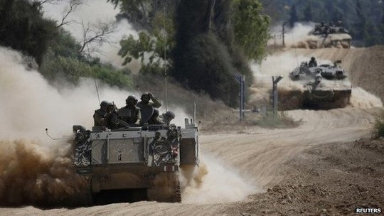 Xe tăng Israel tấn công vào khu vực Shijaiyah ở Dải Gaza hôm 20-7, giết chết ít nhất 99 người Palestine. Ảnh: Reuters, EPA