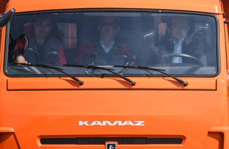 Ông Putin không chỉ lái xe hơi chở khách mà còn lái cả xe tải KamAZ trên đoạn đường của Cầu Crưm. © Sputnik / Grigory Sysoev