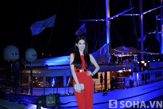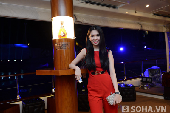 Trong bữa tiệc trên chiếc du thuyền Voyager tối ngày hôm qua, "nữ hoàng nội y" Ngọc Trinh đã xuất hiện trước ống kính phóng viên với bộ jumpsuit đỏ được khoét lưng sâu nhằm tôn lên làn da trắng và những đường cong của cô.