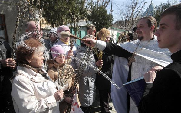 Một mục sư té nước thánh vào các tín đồ nhân dịp kỉ niệm ngày lễ Phục sinh vừa diễn ra hôm Chủ Nhật (ngày 5/4) ở cảng Yevpatoriya, Cộng hòa Tự trị Crimea.
