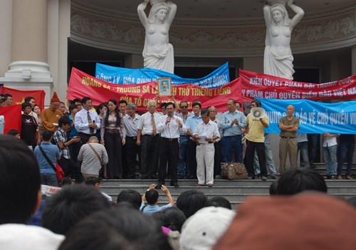 Phía đối diện, Đại sứ quán Trung Quốc vắng lặng, cửa đóng kín. Còn ở bên này, những người con từ mọi nơi, lần đầu gặp mặt đồng thanh hô vang khẩu hiệu "Việt Nam"', "Đả đảo Trung Quốc xâm lược", "Việt Nam muôn năm, Hồ Chủ tịch muôn năm, tướng Giáp muôn năm".