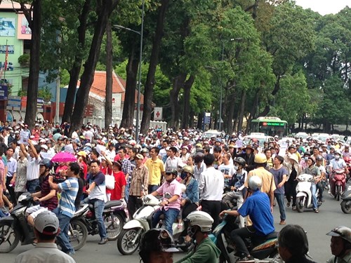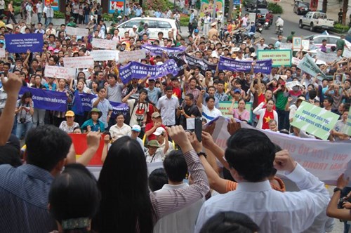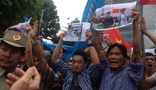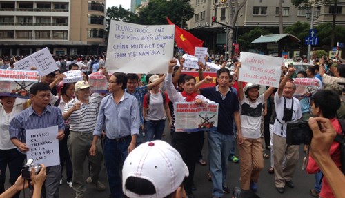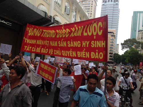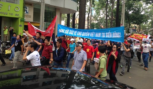 Trước đó, 9g sáng 10-5, trước cửa Lãnh sự quán Trung Quốc tại TP.HCM, nhiều tầng lớp nhân dân TP đã tụ họp lại, biểu thị những bức xúc của mình trước tình hình căng thẳng tại biển Đông. Những lá cờ Tổ quốc được phất lên, những biểu ngữ “Hoàng Sa - Trường Sa là của Việt Nam”, “Trung Quốc vi phạm luật pháp quốc tế”, “Yêu cầu rút giàn khoan HD981 khỏi biển Đông” bằng ngôn ngữ Việt - Trung - Anh được giương cao, những bài hát truyền thống, khẩu hiệu nối tiếp nhau vang suốt dọc đường.