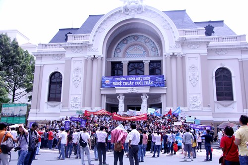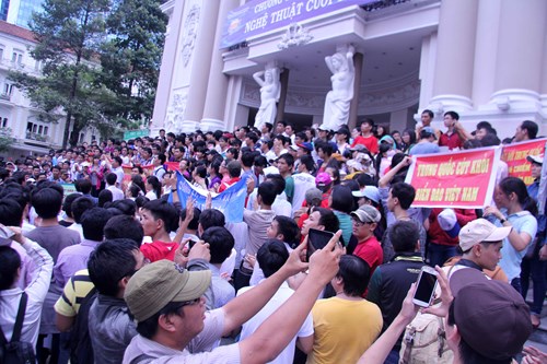 Theo ghi nhận của PV, ngay từ sáng sớm, rất đông người dân TP.HCM đã tập trung tại khu vực Nhà hát TP.HCM (quận 1, TP.HCM) để bày tỏ thái độ phản ứng trước việc Trung Quốc ngang ngược đặt giàn khoan trái phép trong vùng biển thuộc chủ quyền Việt Nam.