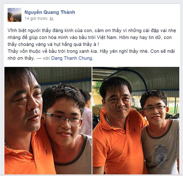 Cậu học trò Nguyễn Quang Thành viết : "Vĩnh biệt người thầy đáng kính của con, cảm ơn thầy vì những cái va đập nhẹ nhàng để giúp con hòa mình vào bầu trời Việt Nam..."