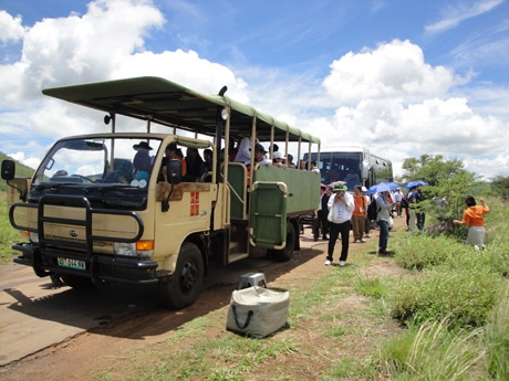 Khách du lịch nước ngoài muốn đi xem tê giác phải ngồi trên những chiếc xe chuyên dụng thế này để đảm bảo an toàn. Ảnh: T.Đ.