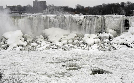 Thác Niaraga - dòng thác khổng lồ hùng vĩ đổ từ biên giới Canada sang đất Mỹ cũng đóng băng tạo nên một cảnh tượng kỳ vỹ xưa nay ít thấy.