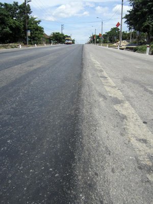 Khoảng hơn 500m mặt đường rải nhựa đã bị biến dạng, xuất hiện những vệt gồ ghề kéo dài. Cùng với đó là những “lòng chảo” kéo dài trên mặt đường.