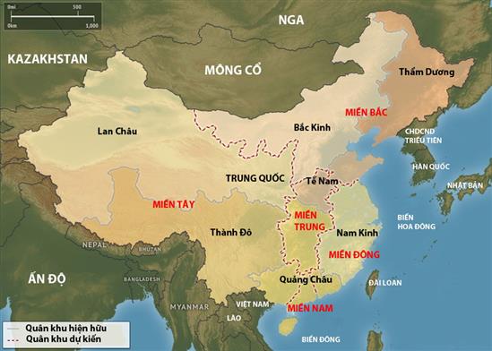 Một trong những kế hoạch sáp nhập các quân khu của Trung Quốc xuống còn 5 quân khu: miền bắc, miền nam, miền trung, miền đông và miền tây.