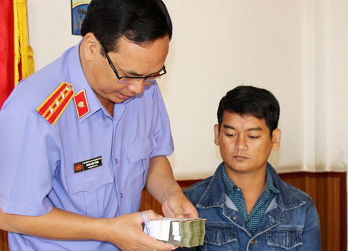 Một trong những nạn nhân là anh Khâu Sóc trong lần nhận tiền bồi thường oan sai nửa năm trước. Ảnh: Việt Tường.