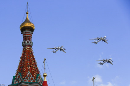Máy bay ném bom tầm xa Tupolev-95MS bay trên bầu trời Quảng trường Đỏ. Ảnh: AP.