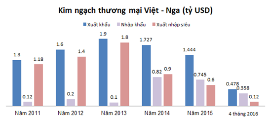 Trong khi đó, các mặt hàng Việt Nam nhập chủ yếu từ Nga, đó là: sắt thép; ô tô nguyên chiếc; than đá; phân bón...
