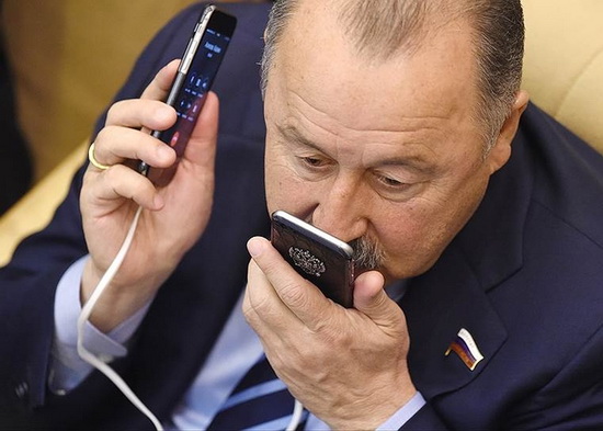 Ông Valery Gazzayev, phó chủ tịch Ủy ban Văn hóa, Thể thao và Du lịch, hai tay cầm hai điện thoại iPhone để luân phiên trò chuyện.