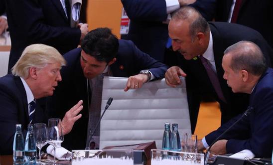Tổng thống Mỹ Donald Trump (trái), Thủ tướng Canada Justin Trudeau (thứ hai từ trái qua) và Tổng thống Thổ Nhĩ Kỳ Recep Tayyop Erdogan (phải) trao đổi trong một phiên họp.