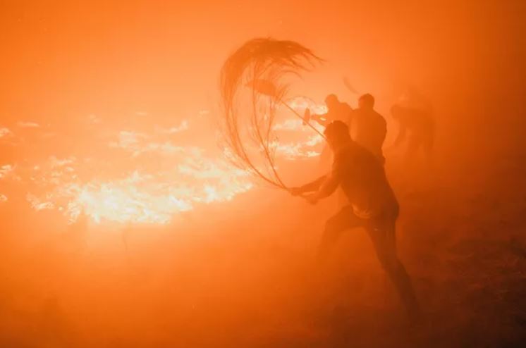Lính cứu hỏa và nhân viên kiểm lâm địa phương làm việc suốt đêm để khống chế đám cháy rừng đe dọa khu dân cư ở giáo xứ Bouces, Galicia, Tây Ban Nha, ngày 19 tháng 8 năm 2025. © Getty Images / Anadolu/Pedro Pascual
