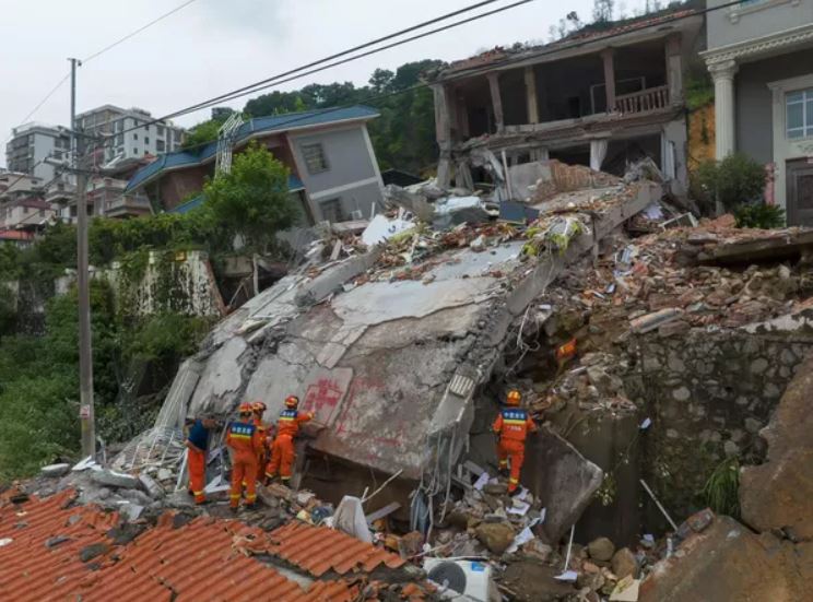 Lực lượng cứu hộ tìm kiếm người sống sót dưới đống đổ nát của một ngôi nhà dân bị sập