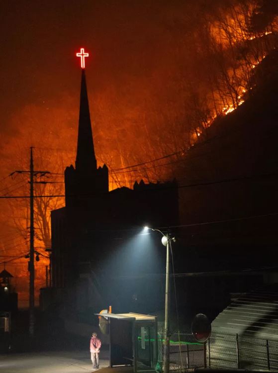 Người đàn ông đi ngang qua nhà thờ Altadena Community đang bốc cháy dữ dội do