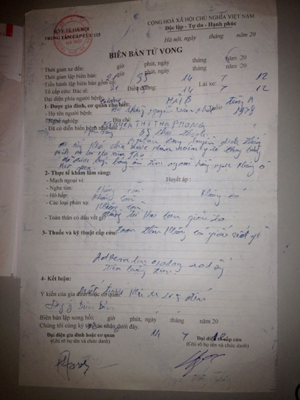 Biên bản chị Phong tử vong được đại diện các bên lập vào lúc 21h35.