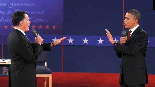 Đương kim Tổng thống Dân chủ Barack Obama và đối thủ Cộng hòa Mitt Romney trong buổi tranh luận 16-10 - Ảnh: Reuters