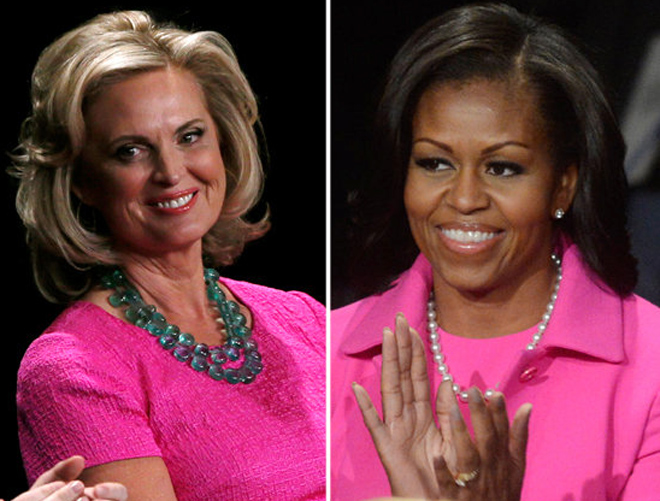 Phu nhân Janna Ryan của ông Mitt Romney (bên trái) và đệ nhất phu nhân Michelle Obama (phải) đụng gu thời trang khi cũng xuất hiện một tông màu trang phục tại buổi tranh luận lần thứ hai của chồng - Ảnh: AFP