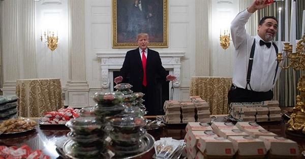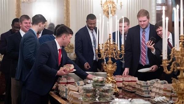 Theo Reuters, thông thường thì các đầu bếp Nhà Trắng sẽ phục vụ khách với các món ăn chu đáo trong phòng tiệc sang trọng, nhưng tối 15-1 ông Trump phải đãi khách toàn bằng thức ăn nhanh đủ nhãn hiệu, từ Burger King, Wendy’s, đến McDonald’s. Một cầu thủ đã thốt lên: “Tôi tưởng đây là chuyện đùa”.