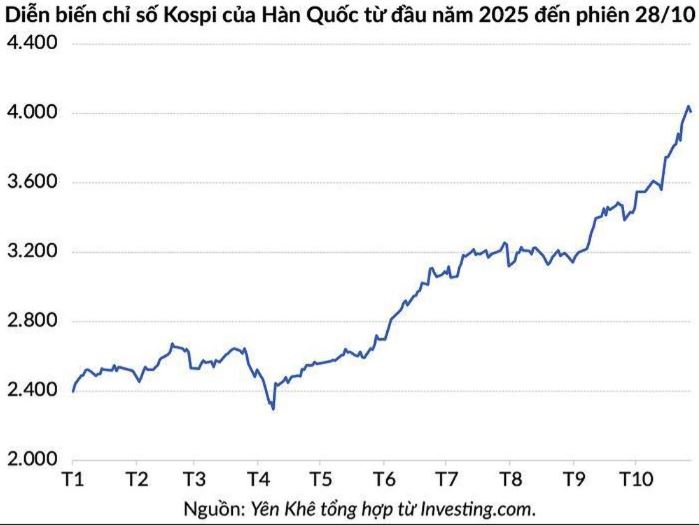 Chỉ số Kospi đã phi mã gần 70% trong năm nay, trở thành một trong những thước đo cổ phiếu tăng tốt nhất thế giới và dĩ nhiên dễ dàng vượt qua mức tăng của các chỉ số chứng khoán Mỹ.