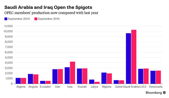 Giá dầu xuống đáy 6 năm trong tháng Tám, khi OPEC duy trì nguồn cung để hạ bệ các công ty sản xuất dầu phiến của Mỹ. Khối cho biết sản lượng dầu thô của các nước thành viên đạt đỉnh cao 3 năm vào tháng Chín, dẫn đầu là Iraq.