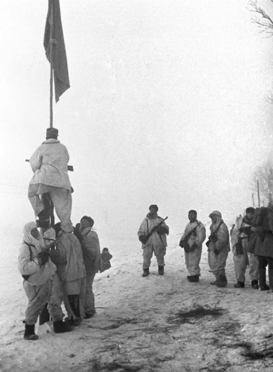 Các chiến sĩ thuộc Phương diện quân Leningrad cắm lá Cờ đỏ bên bờ kênh Novo-Ladoga