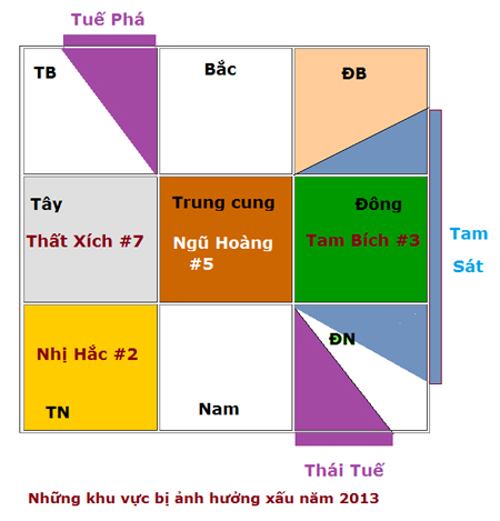 Để tiện theo dõi, những khu vực bị ảnh hưởng xấu trong năm 2013 sẽ được trình bày theo sơ đồ Cửu cung dưới đây. Có thể áp dụng sơ đồ này cho toàn bộ ngôi nhà hay từng căn phòng nơi bạn ở hay làm việc.