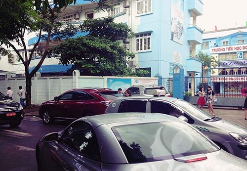Cổng trường Đ.T.Đ trước giờ khởi hành chuyến du học hè Singapore tấp nập “xế xịn” của các gia đình đưa con em đến tham gia “trại hè nghìn đô”.