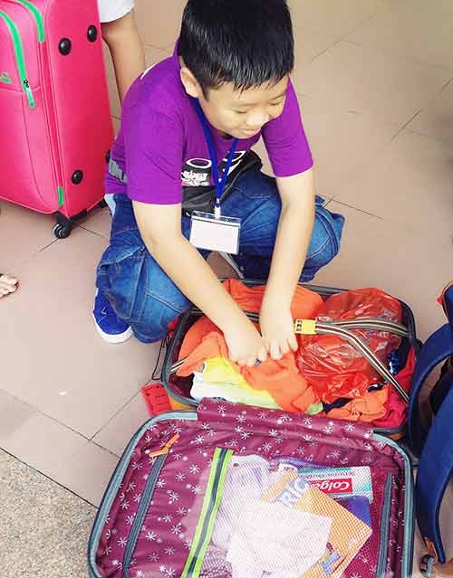 Bé Hải Anh, con trai chị Kim Anh đang tự kiểm tra lại hành lý lần cuối trước khi lên đường. Bố mẹ sẽ chỉ tiễn bé tại sân trường chứ không theo Hải Anh lên tận sân bay.