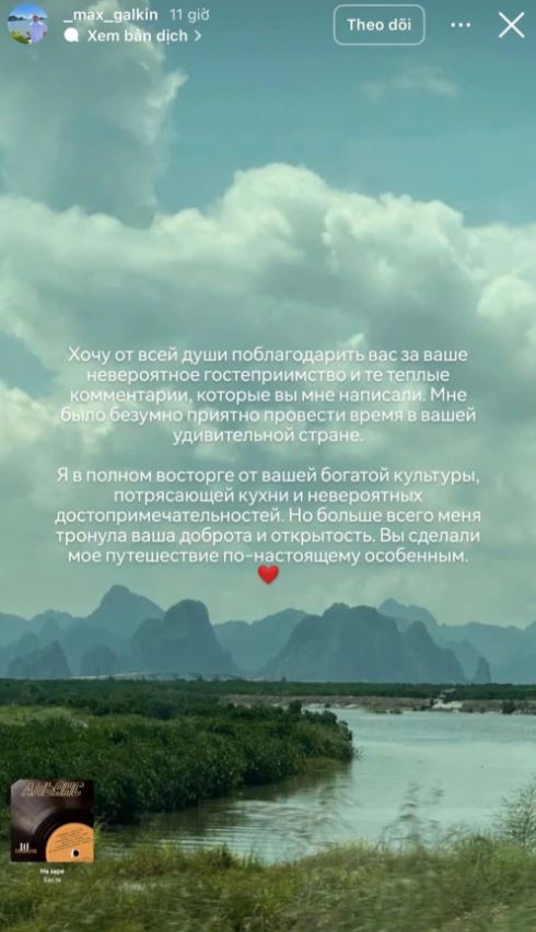 Sau chuyến tham quan vịnh Hạ Long (Quảng Ninh), Maks Galkin - quân nhân Nga gây chú ý trong lễ diễu binh, diễu hành kỷ niệm 80 năm Cách mạng Tháng Tám và Quốc khánh 2/9 tại Hà Nội - đăng tải tâm thư gửi lời cảm ơn tới đất nước và người dân Việt Nam.