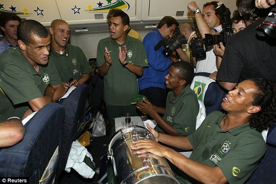Ronaldinho đánh trống cho các đồng đội hát mừng chiến thắng