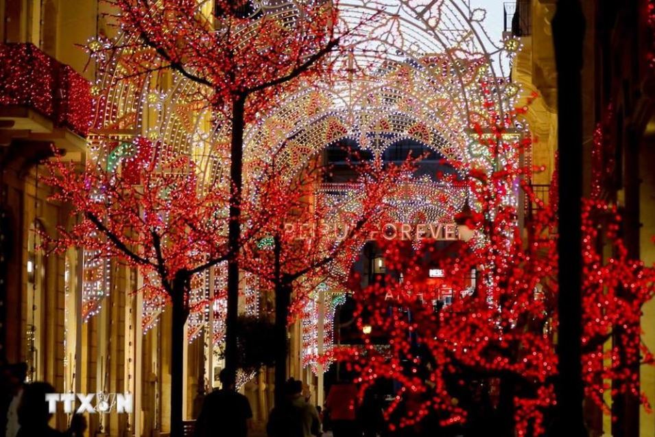 Đường phố được trang hoàng rực rỡ đón Giáng sinh tại Beirut, Liban. (Ảnh: THX/TTXVN)