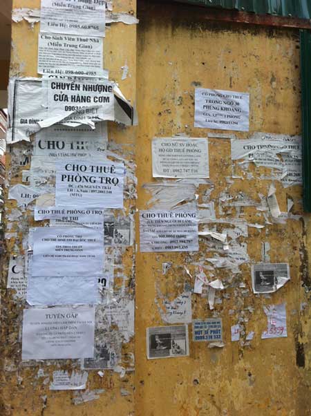 Tờ rơi quảng cáo nhà trọ dán chen chúc nhau ở phố Phùng Khoang