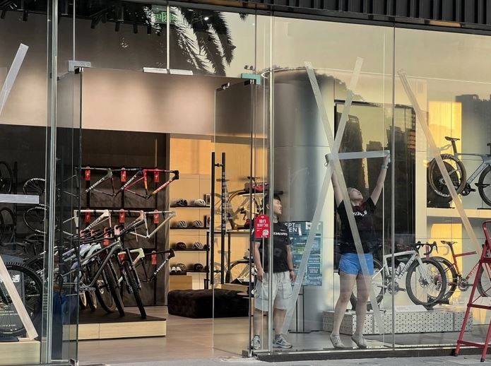Cửa hàng ở Thâm Quyến dán băng keo hình chữ "X" lên cửa kính để chống bão.