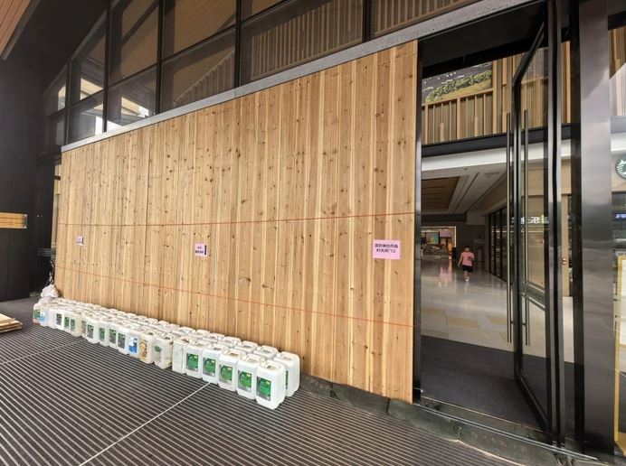 Cửa kính được gia cố bằng ván gỗ và thùng chứa nước. Ảnh: The Paper