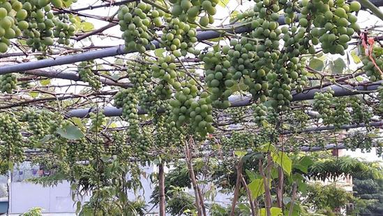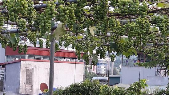 Mặc dù những gốc nho chỉ được trồng trong thùng đất rộng chưa đầy 1m2, nhưng vườn nho trên sân thượng rộng 35m2 trên tầng 3 của nhà anh năm nay cho sản lượng ước khoảng 2 tạ.