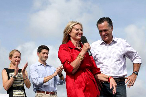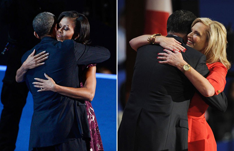 Hai ông luôn nhận được sự ủng hộ nhiệt tình của người bạn đời. Ảnh trái là bà Michelle Obama, ảnh phải là bà Ann Romney, chúc mừng chồng khi các ông chính thức trở thành đại diện của đảng ra tranh cử tổng thống.