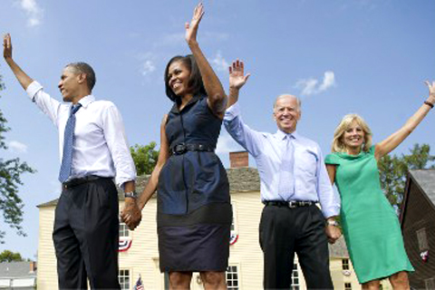 Ông Obama và Phó tổng thống Joe Biden và các phu nhân vẫy chào người dân. Trước cuộc tranh luận trên truyền hình vừa rồi, ông Obama đang dẫn trước ông Romney về điểm ủng hộ trong các cuộc thăm dò.