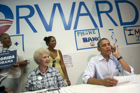 Ông Obama nói chuyện với người ủng hộ qua điện thoại khi đến thăm khu vận động tranh cử ở bang Florida.