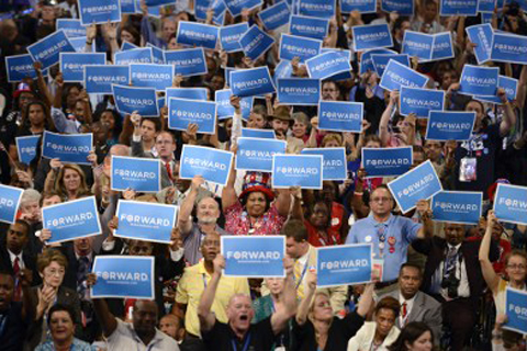 Những người ủng hộ đương kim tổng thống cầm biểu ngữ và hô to khẩu hiệu tranh cử của ông Obama: Tiến lên.