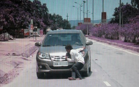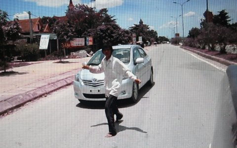 Đầu tiên là một chiếc xe Toyota Vios. Đang ngồi dưới tán cây bên vệ đường, thấy chiếc xe đi từ xa, người này đã lập tức chạy ra rồi giang hai tay, chặn chiếc xe lại. Dường như người lái xe biết được chuyện phải cho tiền mới đi được nên đã nhanh chóng thực hiện để được đi.