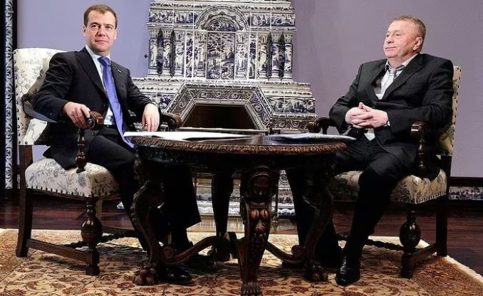 Ngày 24/5/2010, khi đang là Chủ tịch đảng Dân chủ Tự do Nga và Phó Chủ tịch Duma Quốc gia (Hạ viện Nga), ông Vladimir Zhirinovsky (phải) được Tổng thống Nga lúc đó là ông Dmitry Medvedev tiếp và thảo luận về nhiều vấn đề. Ảnh: Điện Kremlin.
