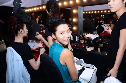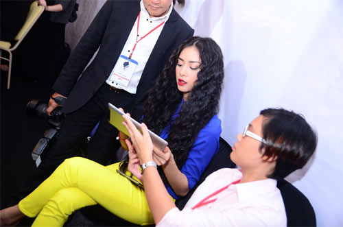 Ngọc nữ của làng giải trí Việt chọn một bộ đầm ren đen thanh lịch tới dự show thời trang của Đỗ Mạnh Cường. Trong khi đó, ở hậu trường, Ngô Thanh Vân hết sức cá tính với tóc dập xù.