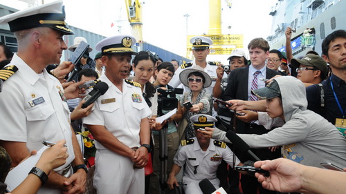 Đại tá Yoichi  Matsui – chỉ huy tàu Nhật Bản Kunisaki trả lời báo chí ngay sau khi tàu cập cảng