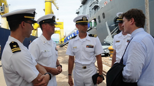 Các thành viên trong đoàn đa quốc gia đang trao đổi công việc sau khi tàu cập cảng Tiên Sa