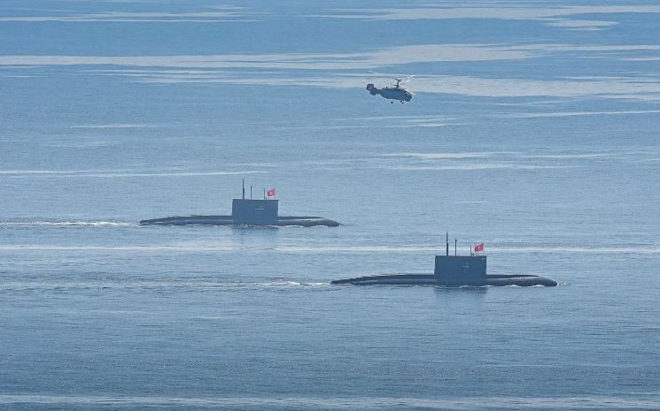 Tàu ngầm và tàu mặt nước của Hải quân nhân dân Việt Nam diễu binh trên biển.