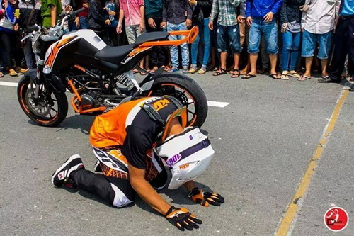 Sự việc xảy ra vào trưa qua (27/4) tại một địa điểm ở thành phố mới Bình Dương. Vận động viên mô tô người Malaysia được mời tham gia biểu diễn. Tuy nhiên, thời điểm đó khán giả tràn vào đường đua khá đông, khiến anh này bất lực và có hành động vái lạy.