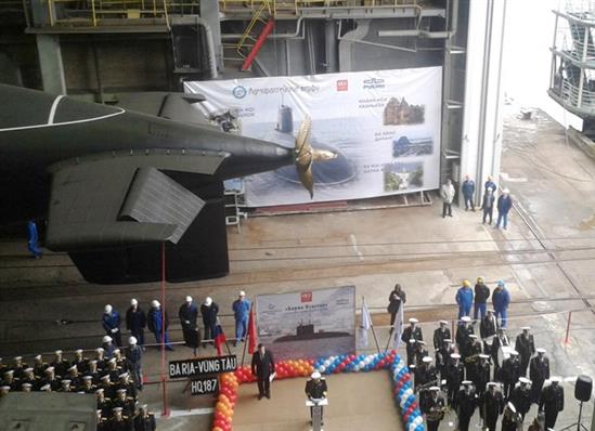 Lễ hạ thuỷ tàu ngầm 187 Bà Rịa - Vũng Tàu tại St.Petersburg (Nga) ngày 28.9.2015. Loại tàu ngầm Kilo của Việt Nam được trang bị tên lửa Klub-S - Ảnh: sledanounas